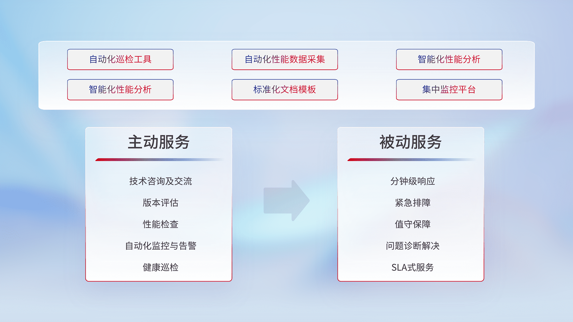 智能化工具和标准化文档,,,,保障服务质量,,,提供主动服务(包含技术咨询、、、版本评估、、性能检查、、、、自动化监控与告警、、、健康巡检)和被动服务包含(分钟级响应、、、、紧急排障、、值守保障、、、问题诊断解决、、SLA服务)。。。